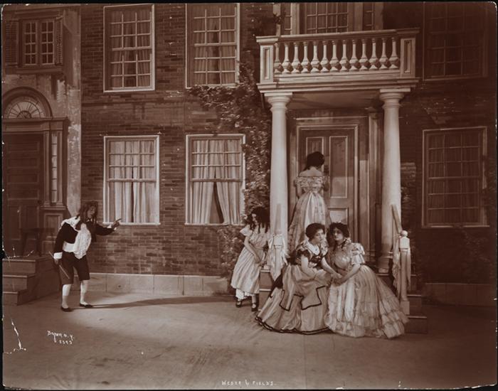 A scene from the Weber & Fields' burlesque of the romantic drama by Cylde Fitch, "Barbara Frietchie." The burlesque, titled "Barbara Fidgety," had book by Edgar Smith, lyrics by Harry B. Smith, music by John Stromberg and featured Mabel Fenton as Barbara Fidgety, David Warfield as Jack Jagley, Charles Ross as Captain Grumble, John T. Kelly as Mr. Fidgety, Lou Fields as Fred Giblets and Joe Weber as Tim Greentz.
