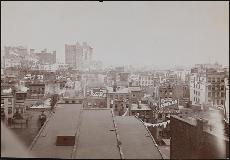 "Advertisements as seen from Brooklyn Bridge" inked on face of similar print.