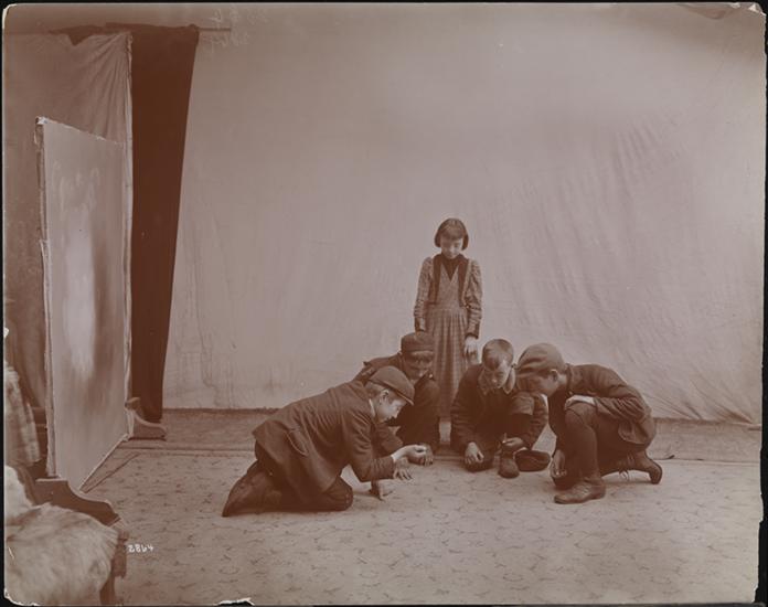 A group of boys posed in a studio with a girl onlooking, playing dice.