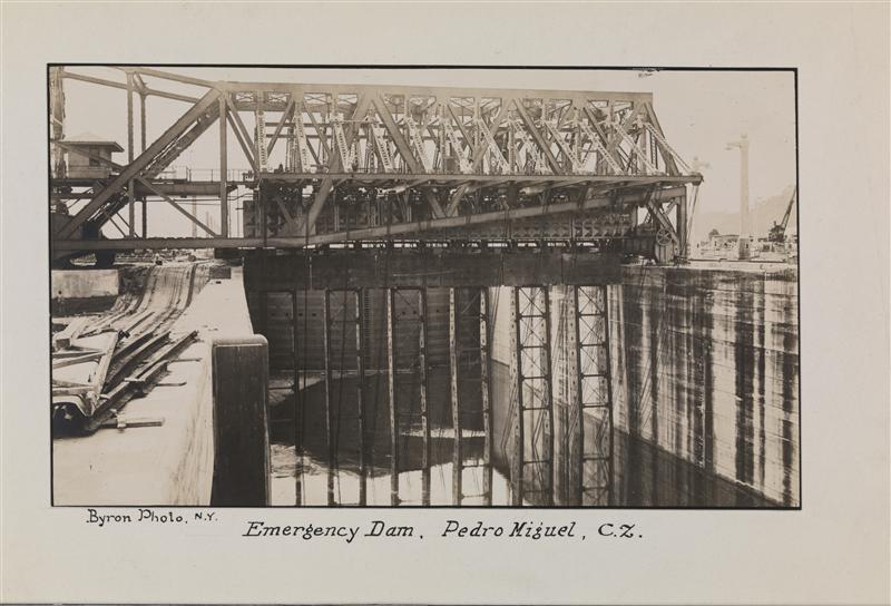 Panama Canal during construction; mount labled "Emergency Dam, Pedro Miguel, C.Z."