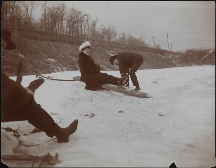 People preparing to ice skate on a frozen lake at McComb's Dam.