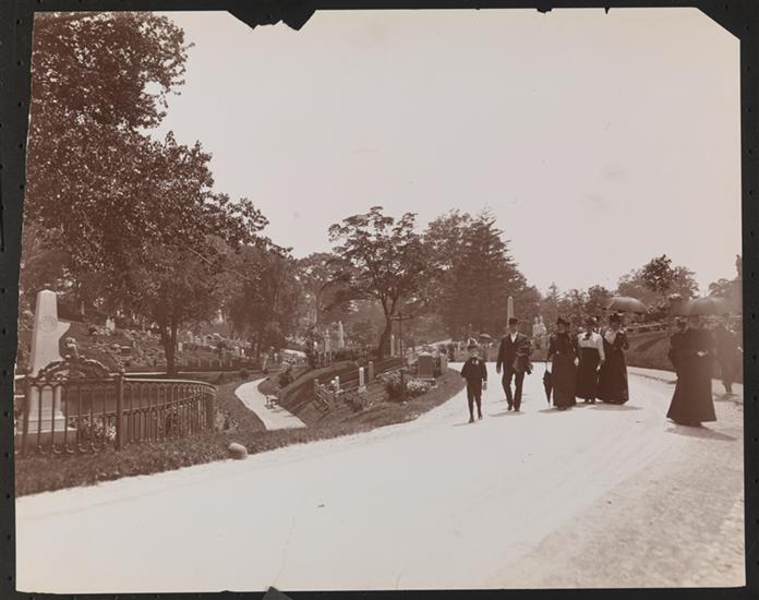 Family at Greenwood Cemetery on Decoration Day, 1899. With sepulchral monuments.
