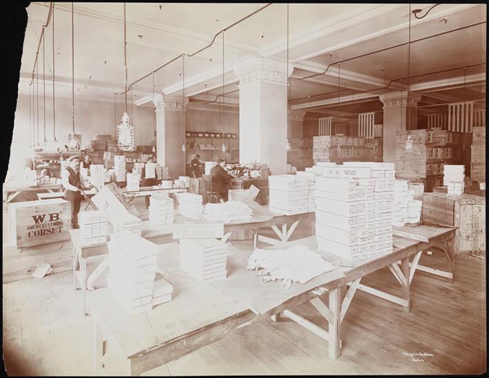 A shipping room at Weingarten Brothers, makers of corsets. Men are at work at tables.