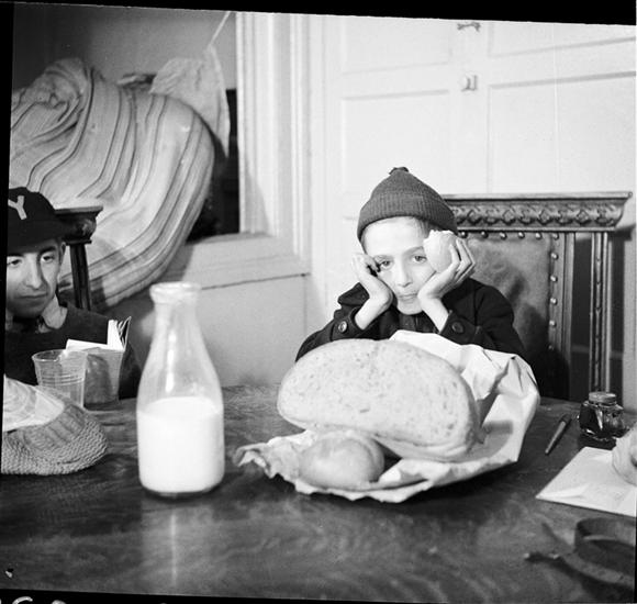 Little Girl with Doll and Tricycle and front of a Shabby Exterior