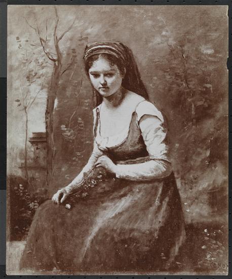 Photograph of a portrait painting of a girl holding a flower; signed "Corot."