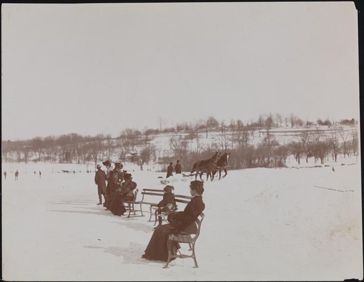 People seated on benches by a frozen lake at Van Cortlandt Park.
