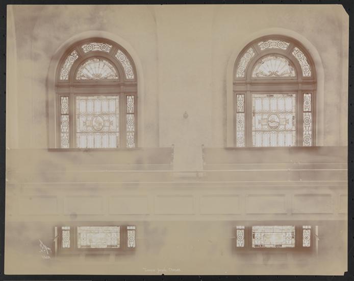 West 114th Street at the corner of 7th Avenue. Ansche Chesed Synagogue brackets and window under balcony, interior.