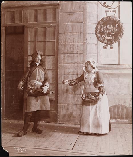 Either two costumed players demonstrating the use of personal props, or a scene from David Belasco's production of his play "Du Barry" featuring Mrs. Leslie Carter in the title role, presented at the Belasco Theatre, Broadway and 42nd Street, New York in 1902.
