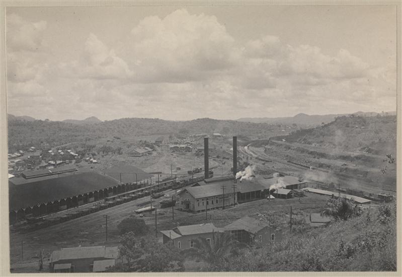 Train yard and industrial buildings near the construction of the Panama Canal.