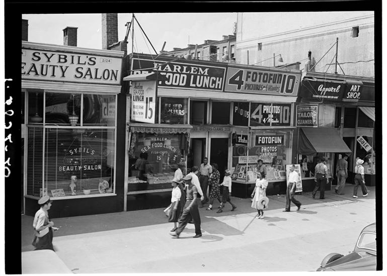 Street Scene in Harlem in front of Daniel's Bar and Grill.
