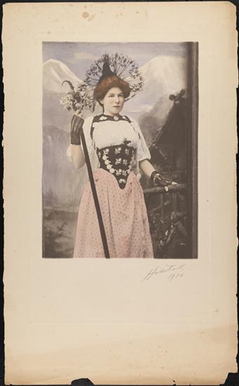 [Unidentified woman in satin dress wearing gloves, a choker, and large hat, with landscape backdrop]