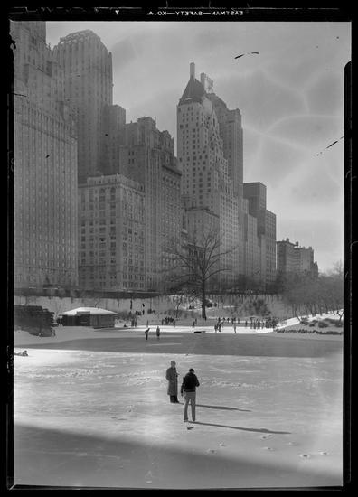 New York City views. 59th Street buidlings over frozen lake, horizontal.