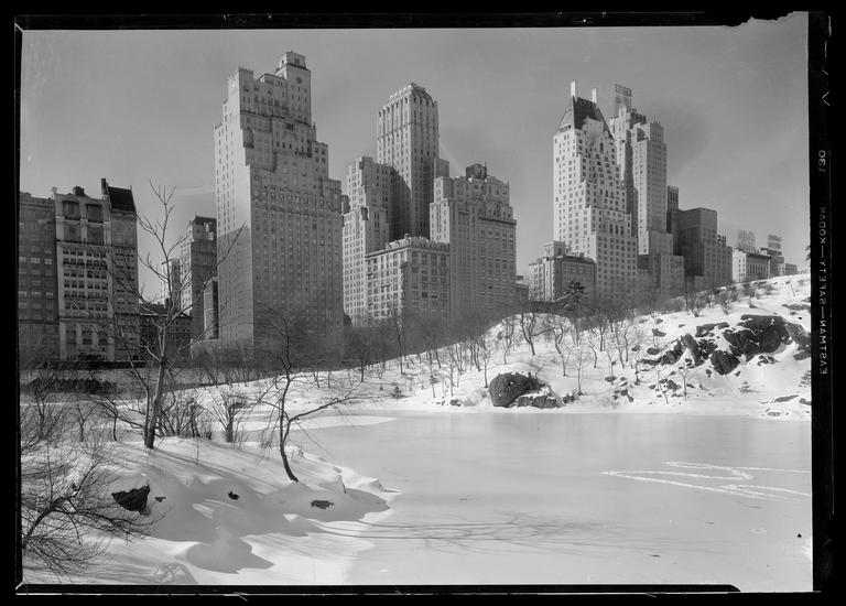 New York City views. 59th Street buidlings over frozen lake, vertical.