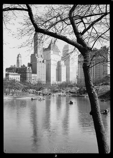 New York City views. 59th Street buidlings over frozen lake, horizontal.