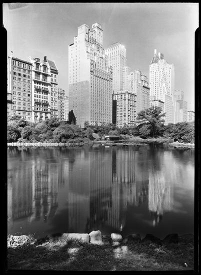 New York City views. St. Moritz Hotel and others, reflected in pond, 3.