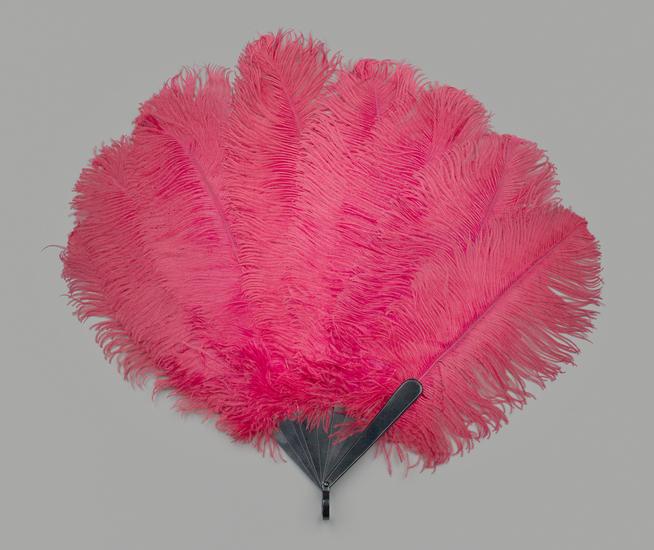 Folding feathered fan of yellow ostrich feathers tipped with birds' heads