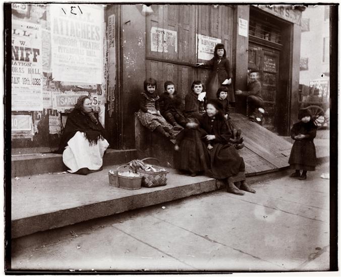 Children in "The Ship," destroyed by B. of Health in 1897, after the visit of Roosevelt & myself [Jacob A. Riis] there.
