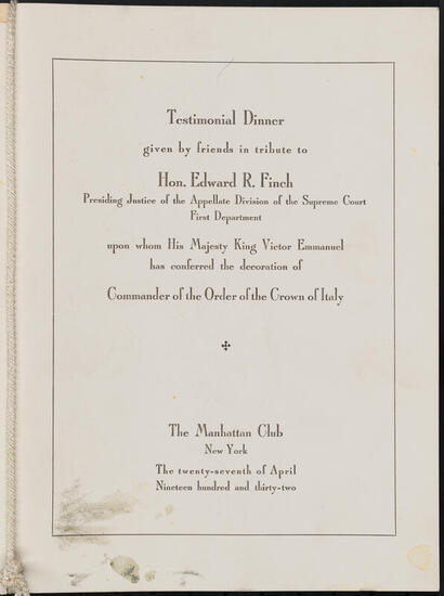 Complimentary Dinner Tendered to Hon. Alfred E. Smith, Hon. Victor J. Dowling, Hon. Morgan J. O'Brien, Hon. Owen D. Young and Hon. Perry Belmont