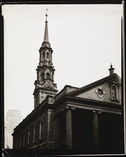 Description St. Paul's Chapel on Broadway betwen Fulton and Vesey Streets, with the New York Telephone Building (140 West Street) behind it.