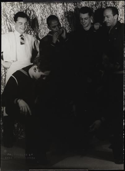 Embossed on recto: PHOTOGRAPH BY / CARL VAN VECHTEN; in ink, on verso: Stage Door Canteen / Dancers: Frank Piro ("Killer Joe") / Charles S. Sebree / Back Row: Busboy Saul Mourikes / Seaman Owen Dodson