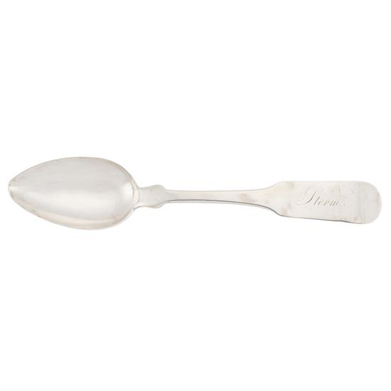 Teaspoon with downturned fiddle handle, back tipt, rounded shoulders, egg-shaped bowl, and single bowl-back drop with old repair to handle. Inscription: Engraved on handle obverse in script: STORM. Mark: On handle reverse in rectangle: ROCKWELL / [lion passant] / [the letter W] / [crown].
