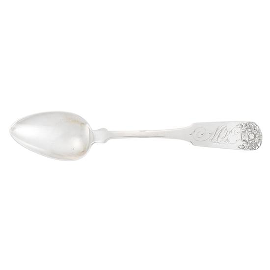 Downturned fiddle handle, rounded and slightly flared shoulders, pointed oval bowl with outlined shell on back and curved drop. Inscription: Engraved on handle obverse, in script: MK. Mark: Marked on handle reverse, in rectangle: D. COHEN.