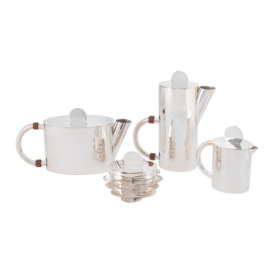 Coffee pot with oval tubular C-shape handle and flat cover, seamed oval body, flat sheet silver lid with finial in form of partial coin, and tubular silver C-scroll handle with cocobola wood insulators. Part of service that consists of a teapot, coffee pot, sugar bowl, and creamer. Mark: Engraved on base: MADE BY BILL O'TOOLE FOR TESS DESIGNS 1984.