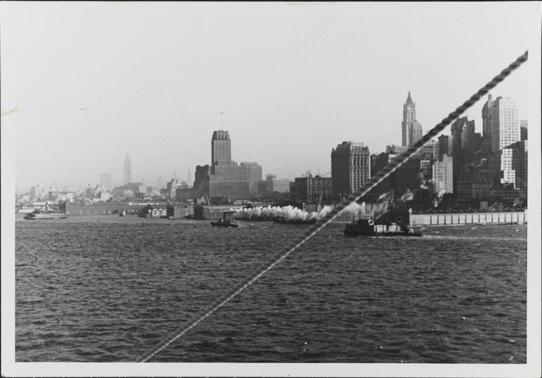 [New York Harbor and Manhattan and Brooklyn skylines.]