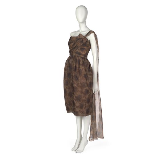 Cocktail dress in camel floral velvet broche on gunmetal silk satin ground