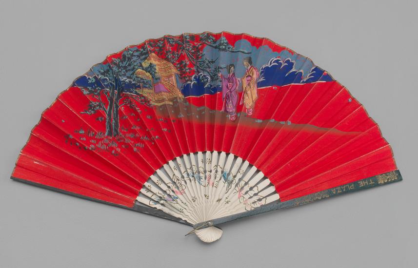 Advertising folding fan of printed paper leaf issued by Maison Prunier