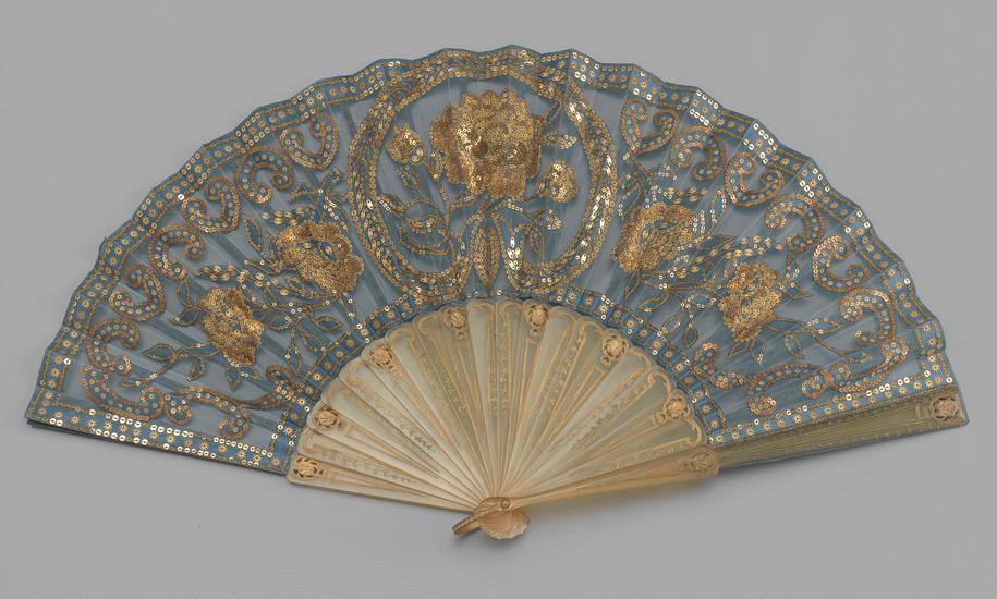 Folding fan of silk embroidered pink gauze leaf with painted birds