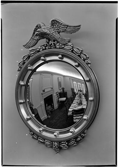 Isabella Barclay [residence]. Louis IV mirror, console and Chinoiserie figure.