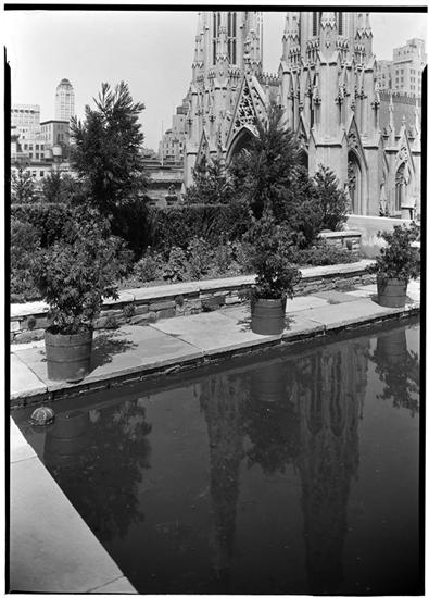 Rockefeller Center. Looking down on City Garden Club and fountain from British Building.