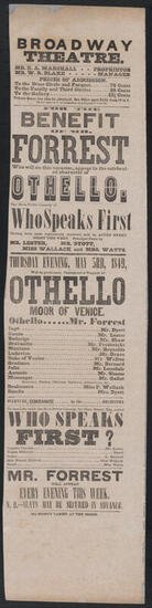 On Wednesday evening, April 27, 1853, will be performed for the last time, Shakespeare's sublime tragedy of "Othello, the Moor of Venice", with Mr. Forrest as Othello