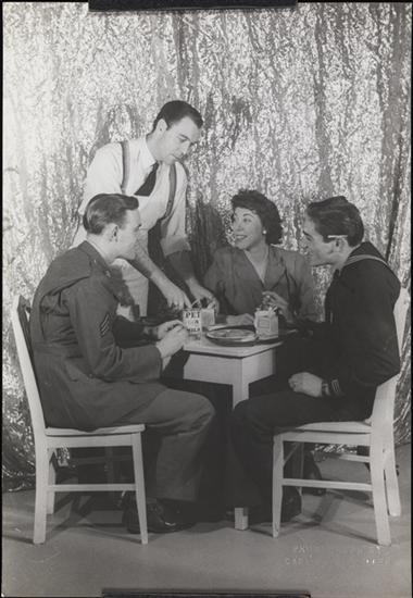 French Sailor from the Richelieu, Albert, Junior Hostesses Shirley Booth and Janet Fox, Busboy Tom Rutherford and Sergeant Richard Mulligan (Stage Door Canteen).
