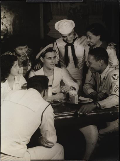 Embossed on recto: PHOTOGRAPH BY / CARL VAN VECHTEN; in ink, on verso: Stage Door Canteen / Foreground: Seaman Michael Bonifazio / Junior Hostess Captain Elaine Kent / " " Helene Tsang / French Sailor