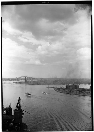 Views from 80th Street and East River. View northeast, Welfare Island and Hell Gate Bridge.