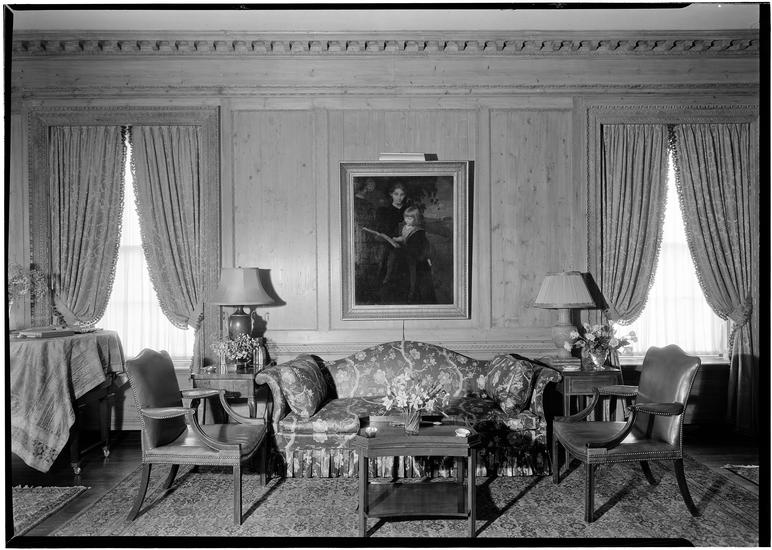 Thomas Cochrane [residence]. Table, lamp, chest and painting.