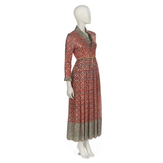 Evening ensemble in geometric printed cotton velveteen, comprising cloak and dress