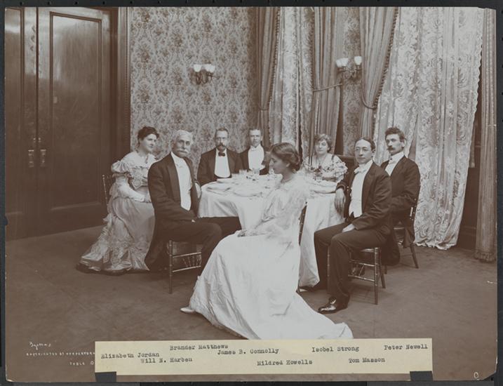 Group posed at a table at the dinner given to Mark Twain in honor of his 70th birthday at Delmonico's. This group is "Table O," including Elizabeth Jordan, Will N. Harben, Brander Matthews, James B. Connolly, Mildred Howells, Isobel Strong, Tom Masson and Peter Newell.