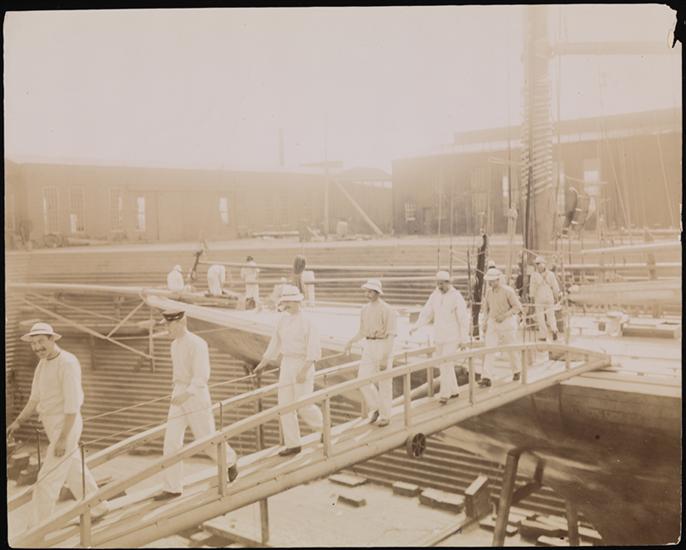"895" in pencil on verso--first series neg number. | "Sunday Aug 25 8 P.M./The Crew leaving the Valkyrie to go to their Tender for breakfast" in pencil on verso.