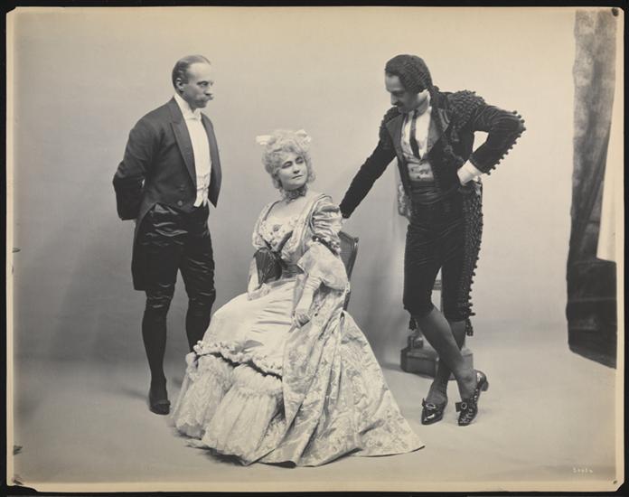 Portrait of opera singer Antonio Scotti with an unidentified man and woman at the James Hazen Hyde Ball, January 31, 1905.