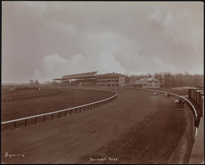 Horses pulling rakes over the track, grooming the dirt, at Belmont Park Race Track, Elmont N.Y.