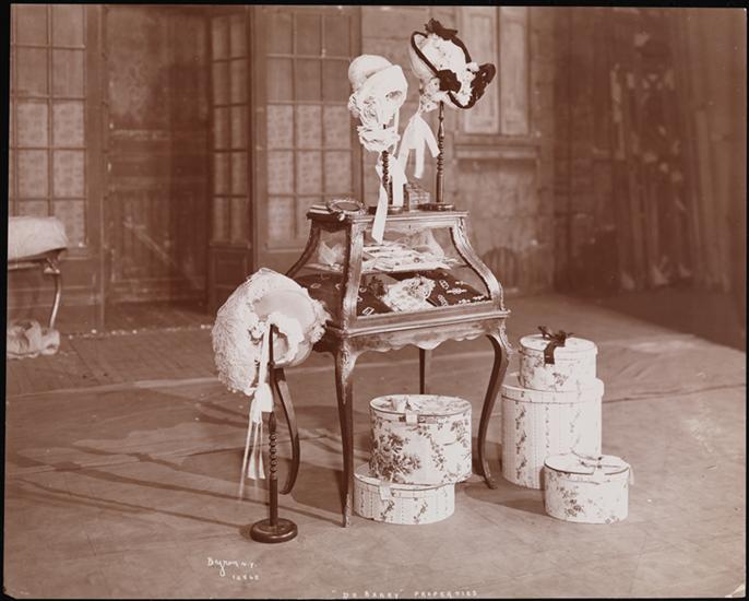 A selection of millnery, jewelry and accessories used as costuming in the David Belasco production of his play "Du Barry," presented in 1902 at the Belasco Theatre, Broadway at 42nd Street, New York.