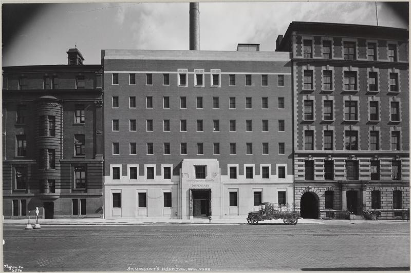 12th Street and 7th Avenue. St. Vincent's Hospital, general exterior of Al Smith Building.
