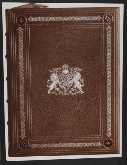 Close-up of a leather book cover with gilt decoration by Walter Dunn, publisher; "Prayer Book of Edward VII, 1903" visible on the spine of this cover in similar print.